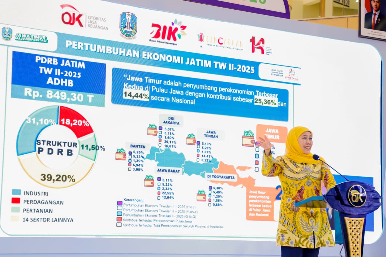 Lebih lanjut, Gubernur perempuan pertama di Jawa Timur ini menyampaikan bahwa OJK Jatim dan Pemprov Jatim memiliki peran strategis dalam menopang perekonomian nasional. Dengan nilai PDRB mencapai Rp849,30 triliun, Jawa Timur berkontribusi sebesar 14,44 persen terhadap ekonomi nasional dan 25,36 persen terhadap perekonomian Pulau Jawa.