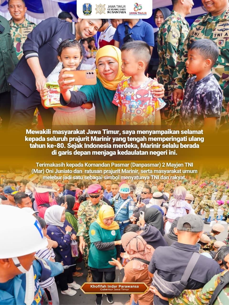 "Mewakili masyarakat Jawa Timur, saya menyampaikan selamat kepada seluruh prajurit Marinir yang hari ini memperingati ulang tahun ke-80. Sejak Indonesia merdeka, Marinir selalu berada di garis depan menjaga kedaulatan negeri ini. Semoga Marinir Indonesia terus berjaya dan menjadi penjaga kedaulatan yang tangguh di darat, laut, dan udara,” pungkasnya