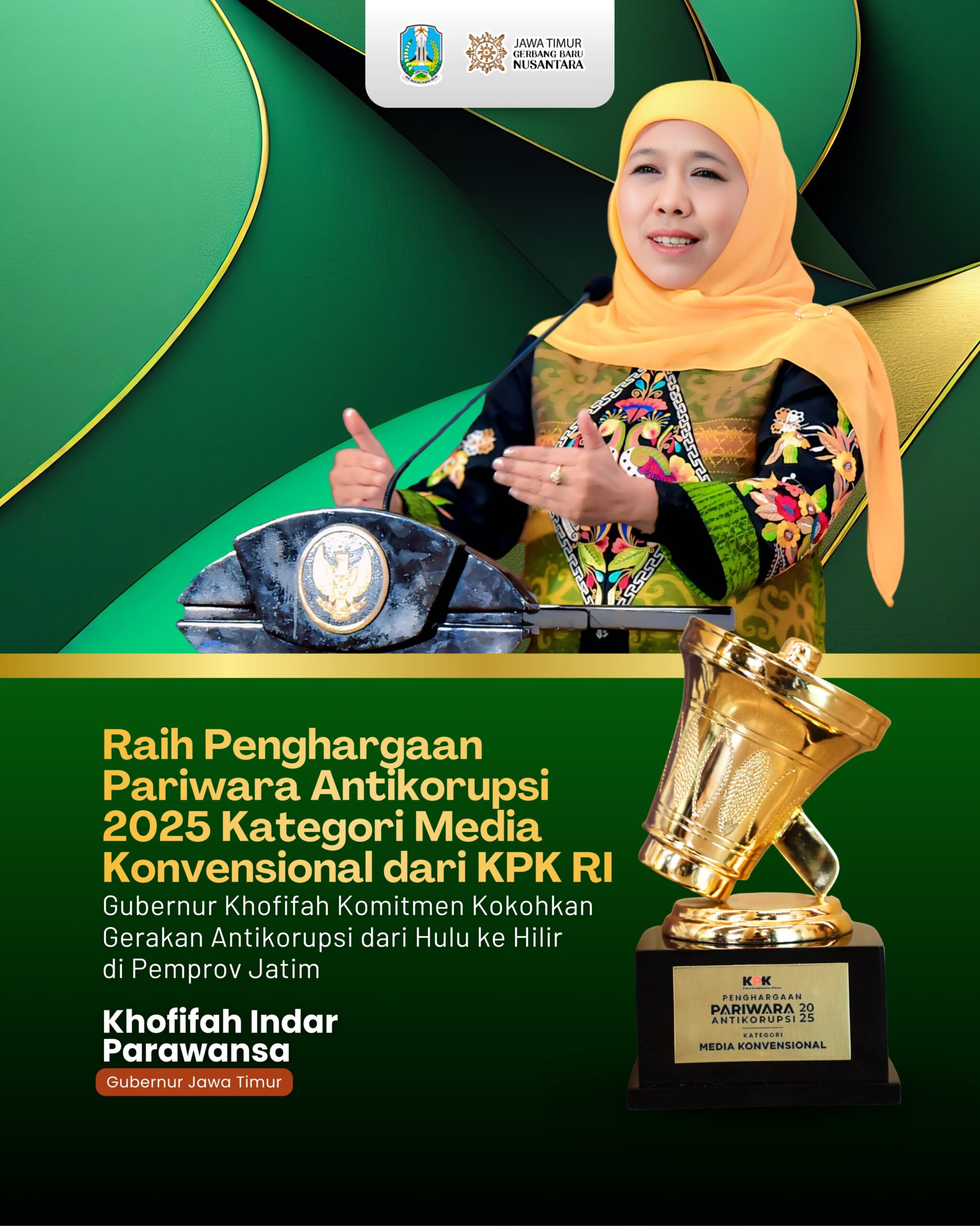 Jakarta, 1 Desember 2025 – Pemerintah Provinsi Jawa Timur meraih Penghargaan Pariwara Anti Korupsi 2025 untuk Kategori Media Konvensional dari Komisi Pemberantasan Korupsi (KPK) RI. Penghargaan tersebut disampaikan dalam Puncak Apresiasi Pariwara Anti Korupsi dan Anti-Corruption Film Festival (ACFFEST) 2025 yang digelar di Taman Ismail Marzuki (TIM), Jakarta, Jumat (28/11).