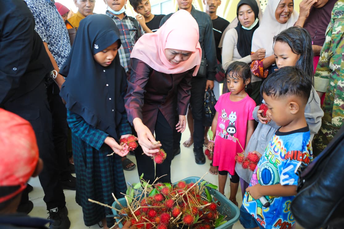 Didampingi Bupati Pidie Jaya Sibral Malasyi, Gubernur Khofifah bersapa dan berbincang dengan para pengungsi dan menguatkan mental dan psikis mereka.