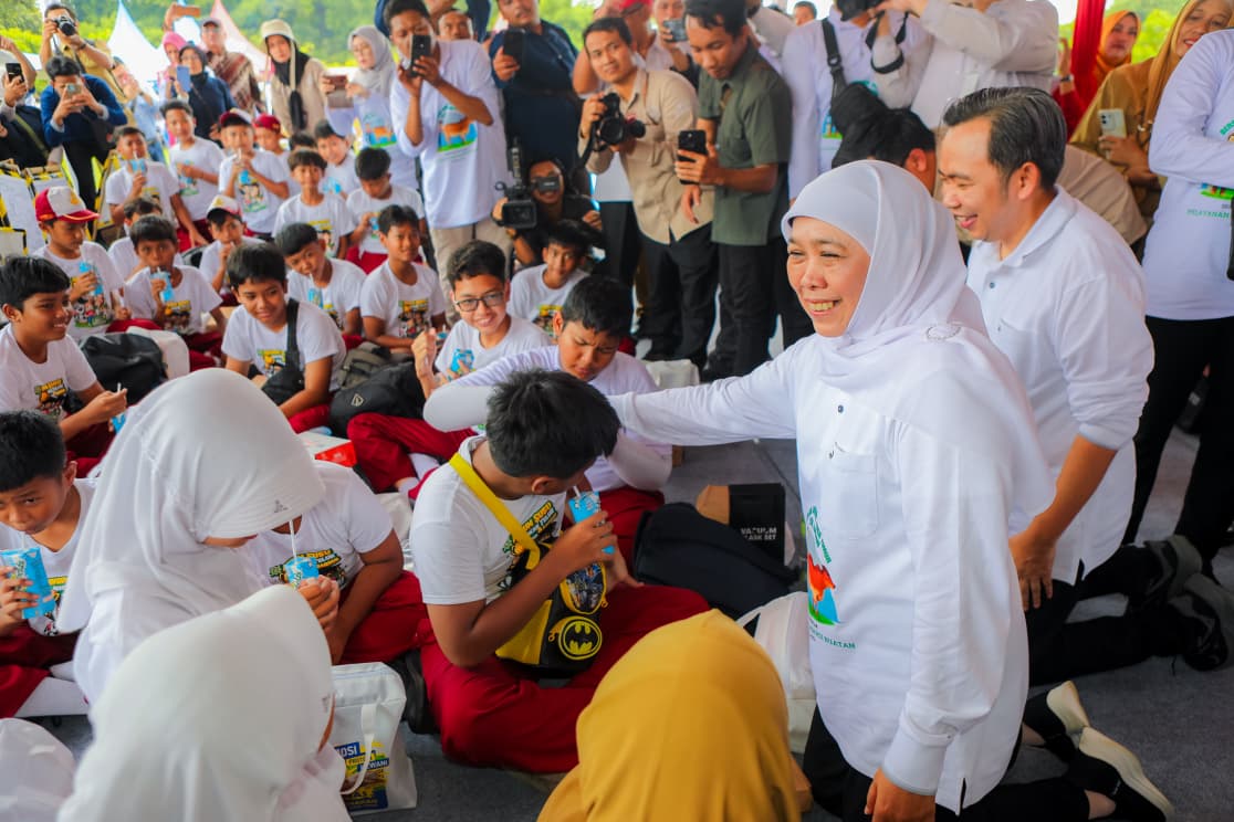 Didampingi Bupati Jember Muhammad Fawait, Gubernur Khofifah menghampiri anak-anak yang duduk lesehan sambil memegang susu kemasan produksi salah satu produsen dalam negeri. Tawa dan sorak spontan pecah saat Gubernur Khofifah mengajak mereka minum susu bersama-sama.