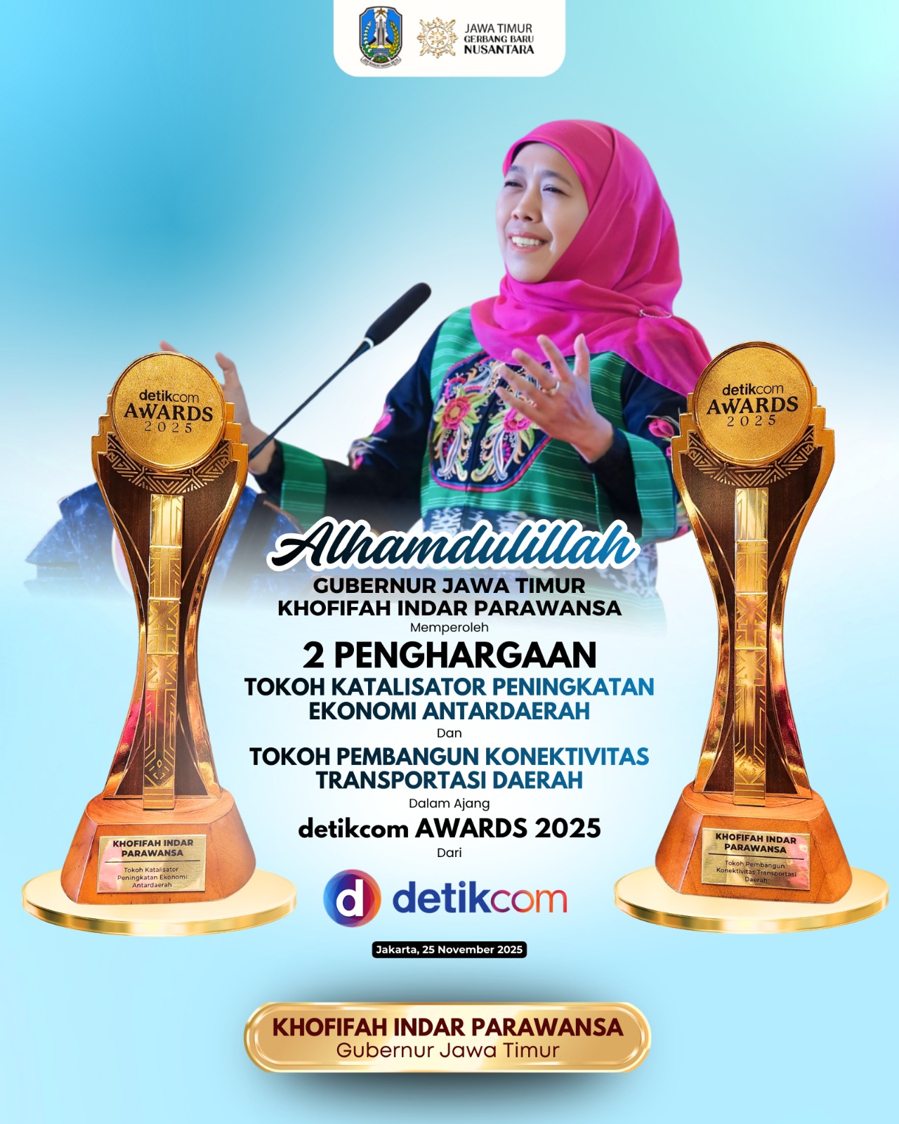 Penghargaan ini diberikan langsung oleh Direktur Utama Detikcom Abdul Aziz kepada Gubernur Khofifah di Hotel Westin Jakarta, Selasa (25/11/2025) malam.