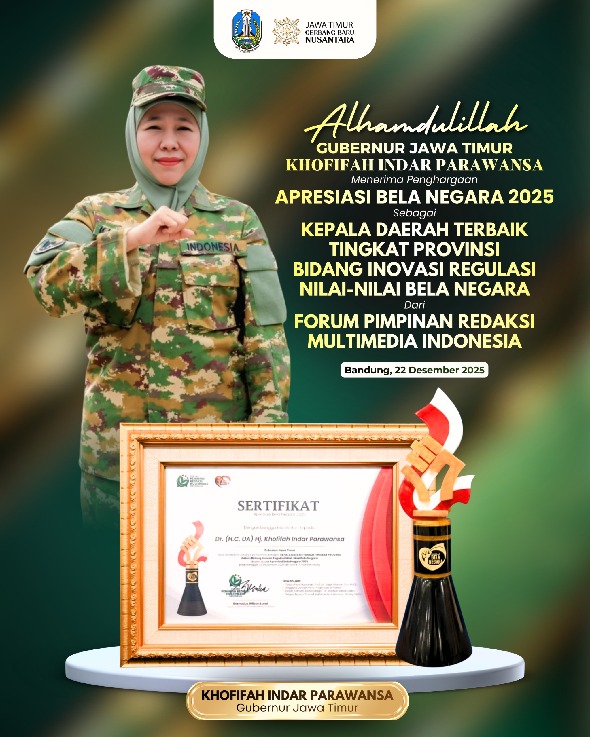 SURABAYA, 23 DESEMBER 2025 – Gubernur Jawa Timur Khofifah Indar Parawansa meraih Penghargaan Kepala Daerah Terbaik Tingkat Provinsi Bidang Inovasi Regulasi Nilai-Nilai Bela Negara dari Forum Pimpinan Redaksi Multimedia Indonesia (FPRMI).