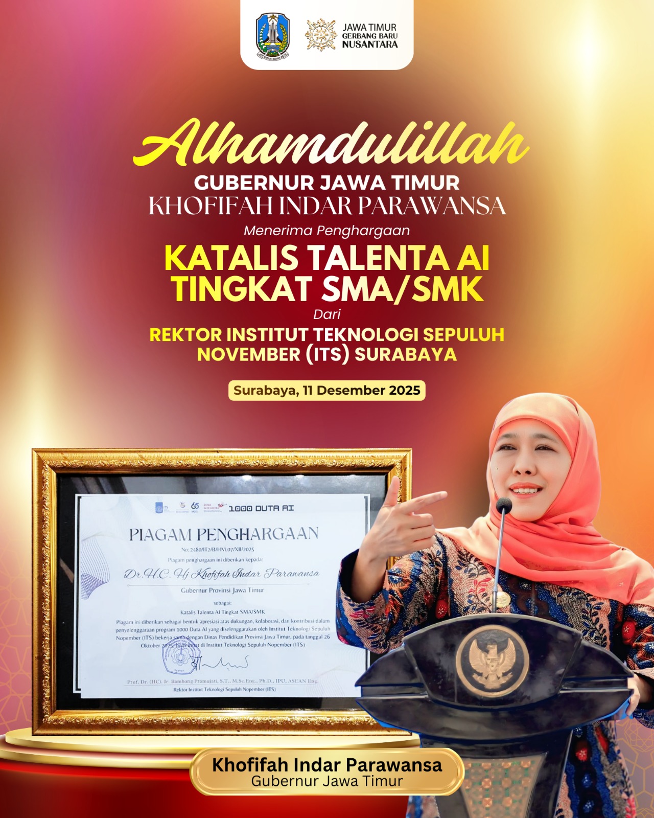 SURABAYA, 15 DESEMBER 2025 – Pemerintah Provinsi Jawa Timur kembali memperoleh pengakuan prestisius di bidang pendidikan dengan meraih penghargaan “Katalis Talenta AI SMA/SMK” dalam ajang Artificial Intelligent Talent and Innovation Day (ATID) 2025 yang diselenggarakan Institut Teknologi Sepuluh Nopember (ITS) Surabaya, Minggu lalu.