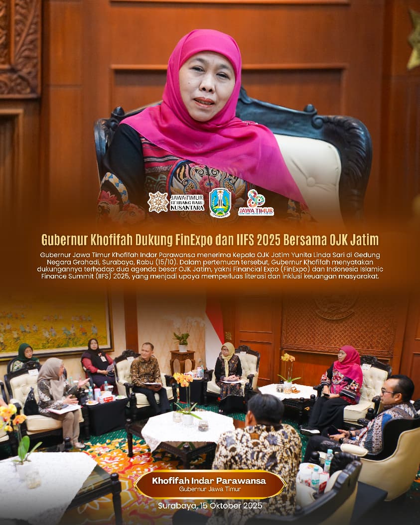 Gubernur Jawa Timur Khofifah Indar Parawansa menyampaikan komitmennya untuk mendukung penuh dua agenda besar yang akan diselenggarakan Otoritas Jasa Keuangan (OJK) Provinsi Jawa Timur, yakni Financial Expo (FinExpo) dan Indonesia Islamic Finance Summit (IIFS) 2025.