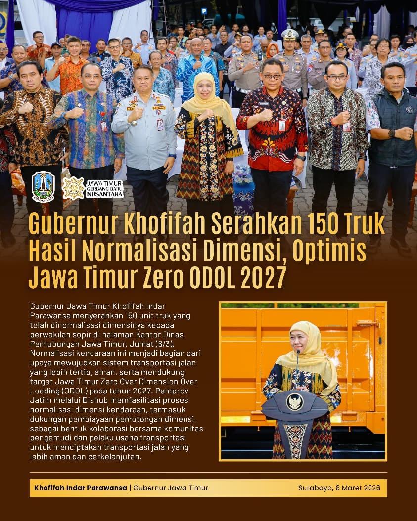 "Apa yang kita lakukan hari ini merupakan bagian dari ikhtiar kita bersama dalam normalisasi kendaraan ODOL. InsyaAllah kalau kita gerak bersama Jawa Timur Zero ODOL Tahun 2027,” ujar Khofifah.