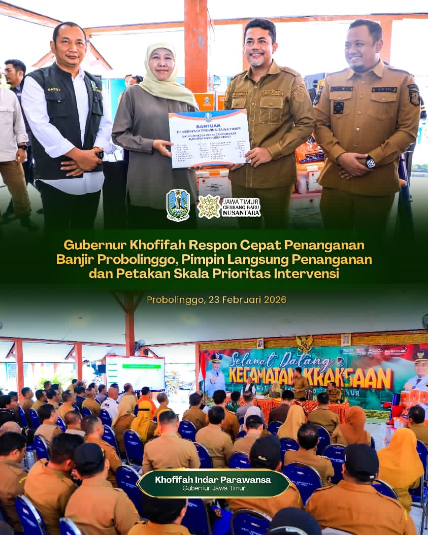 PROBOLINGGO, 23 FEBRUARI 2026 – Gubernur Jawa Timur Khofifah Indar Parawansa bersama Bupati Probolinggo M. Haris turun langsung pastikan efektifitas penanganan dampak banjir yang menerjang sejumlah wilayah di Kabupaten Probolinggo, Senin (23/2).