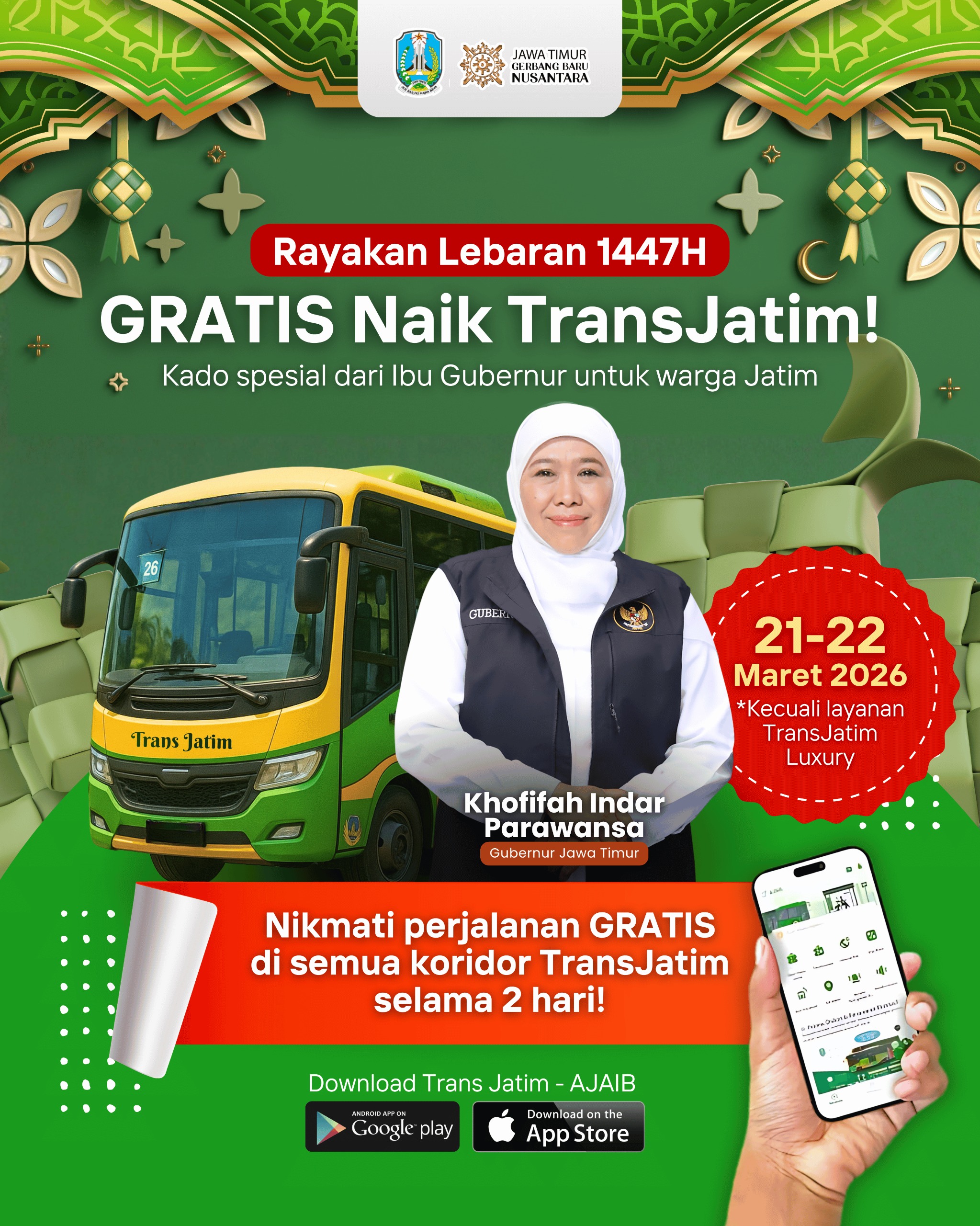 SURABAYA, 18 MARET 2026 – Gubernur Jawa Timur Khofifah Indar Parawansa kembali menghadirkan kebijakan pro-rakyat dalam menyambut Idul Fitri 1447 Hijriah. Yakni berupa kado istimewa bagi masyarakat berupa layanan transportasi publik Trans Jatim gratis selama dua hari, yakni pada 21–22 Maret 2026.
