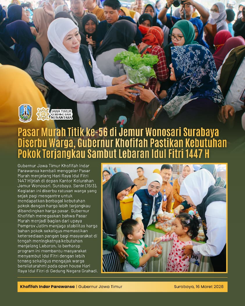 SURABAYA, 16 MARET 2026 – Menjelang Idul Fitri 1447 Hijriah, Gubernur Jawa Timur Khofifah Indar Parawansa menggencarkan pelaksanaan Pasar Murah guna membantu masyarakat memperoleh bahan kebutuhan pokok dengan harga terjangkau sekaligus menjaga stabilitas harga di pasaran.