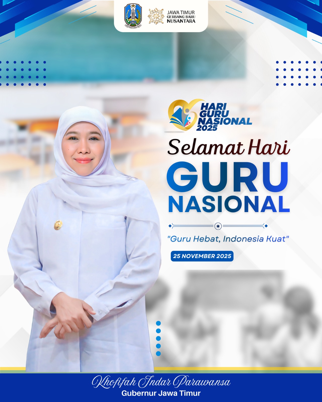 “Selamat Hari Guru Nasional. Terima kasih kepada seluruh guru di Jawa Timur atas dedikasi yang tidak pernah surut. Capaian pendidikan sepanjang tahun ini membuktikan bahwa semangat dan pengabdian para guru adalah energi utama kemajuan Jawa Timur,” pungkas Khofifah.
