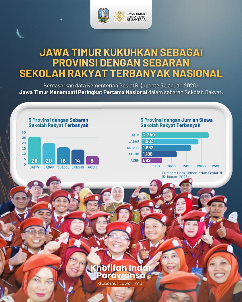 “Dari 26 SR di Jawa Timur tersebut terdapat 2.450 siswa yang sudah menuntut ilmu di Sekolah Rakyat. Terima kasih kepada Menteri Sosial RI dan semua pihak maupun elemen yang sudah ikut berkontribusi dalam program SR di Jatim,” jelasnya.