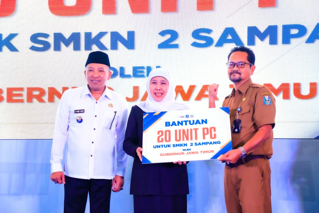 Pada kesempatan yang sama, Gubernur Khofifah turut menyerahkan bantuan pendidikan kepada 40 siswa SMA dan SMK berprestasi dari keluarga prasejahtera se-Madura, masing-masing sebesar Rp1.000.000. Selain itu, diserahkan pula bantuan 20 unit komputer kepada SMKN 2 Sampang untuk mendukung penguatan pembelajaran berbasis teknologi.