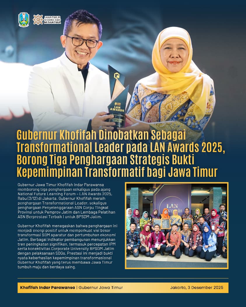 Dalam hal ini, Khofifah merupakan satu-satunya gubernur penerima penghargaan Transformational Leader di ajang LAN Awards 2025 ini. Untuk BPSDM Jatim sendiri telah meraih penghargaan lembaga pendidikan berprestasi terbaik untuk keempat kalinya.