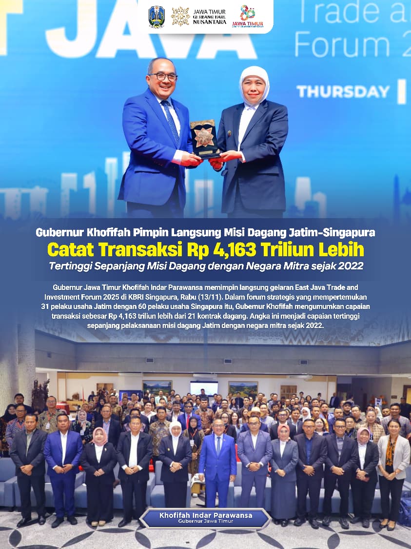 Sebagai informasi, neraca perdagangan antara Provinsi Jawa Timur dengan Singapura pada periode Januari – Agustus 2025, Jawa Timur mencatat surplus sebesar USD 379,19 juta, dengan nilai ekspor nonmigas mencapai USD 845,53 juta dan nilai impor sebesar USD 466,34 juta.