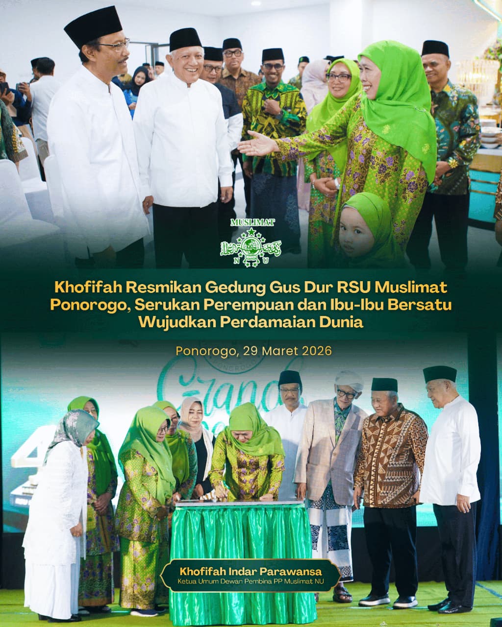 PONOROGO, 4 April 2026 – Ketua Umum Dewan Pembina PP Muslimat NU yang juga Gubernur Jawa Timur Khofifah Indar Parawansa meresmikan Gedung KH. Abdurrahman Wahid (Gus Dur) RSU Muslimat Ponorogo, Minggu lalu sebagai penanda penguatan layanan kesehatan inklusif berbasis keumatan sekaligus modernisasi fasilitas kesehatan di daerah.