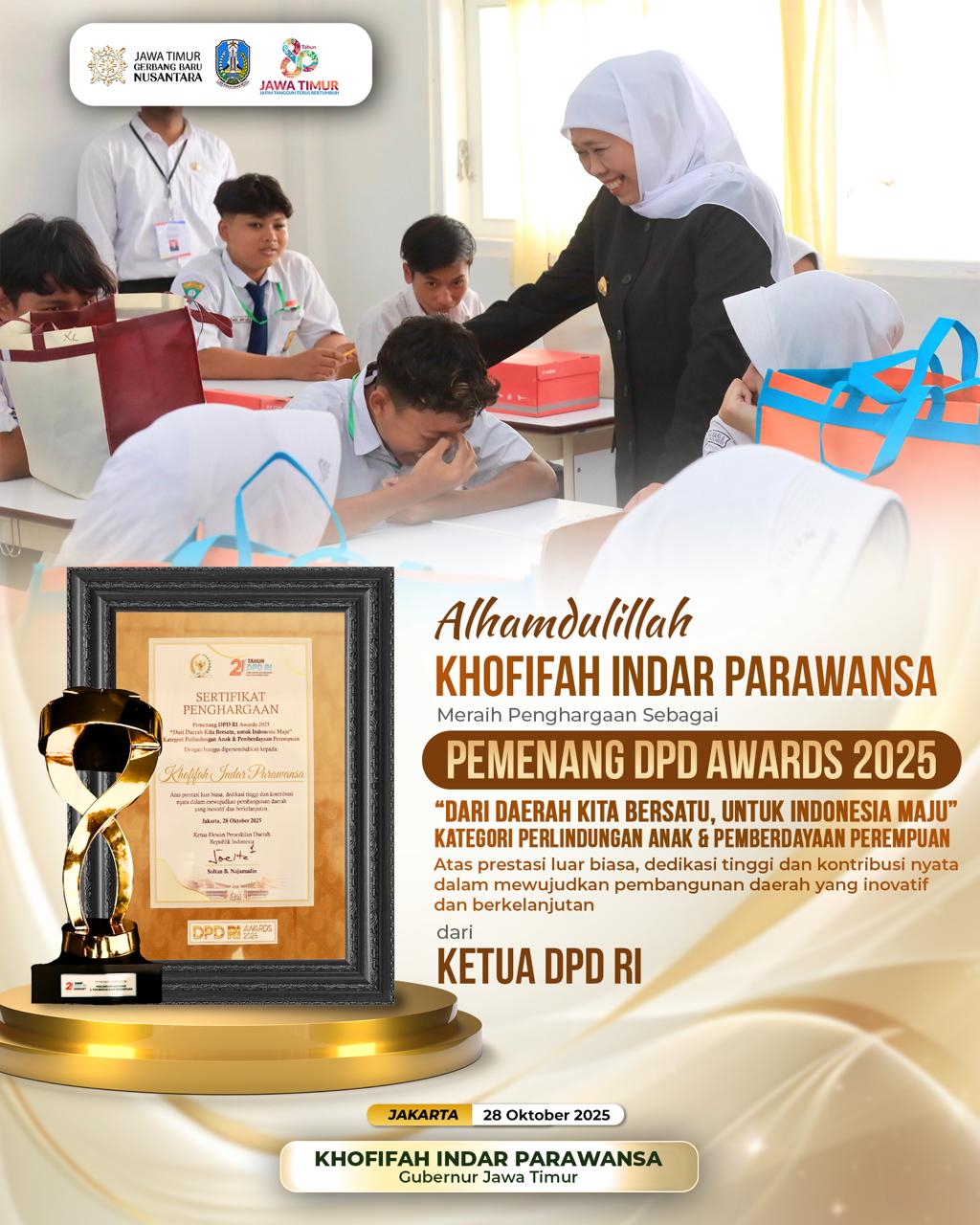 Gubernur Jawa Timur Khofifah Indar Parawansa menerima Penghargaan DPD RI Awards 2025 untuk kategori Perlindungan Anak dan Pemberdayaan Perempuan.