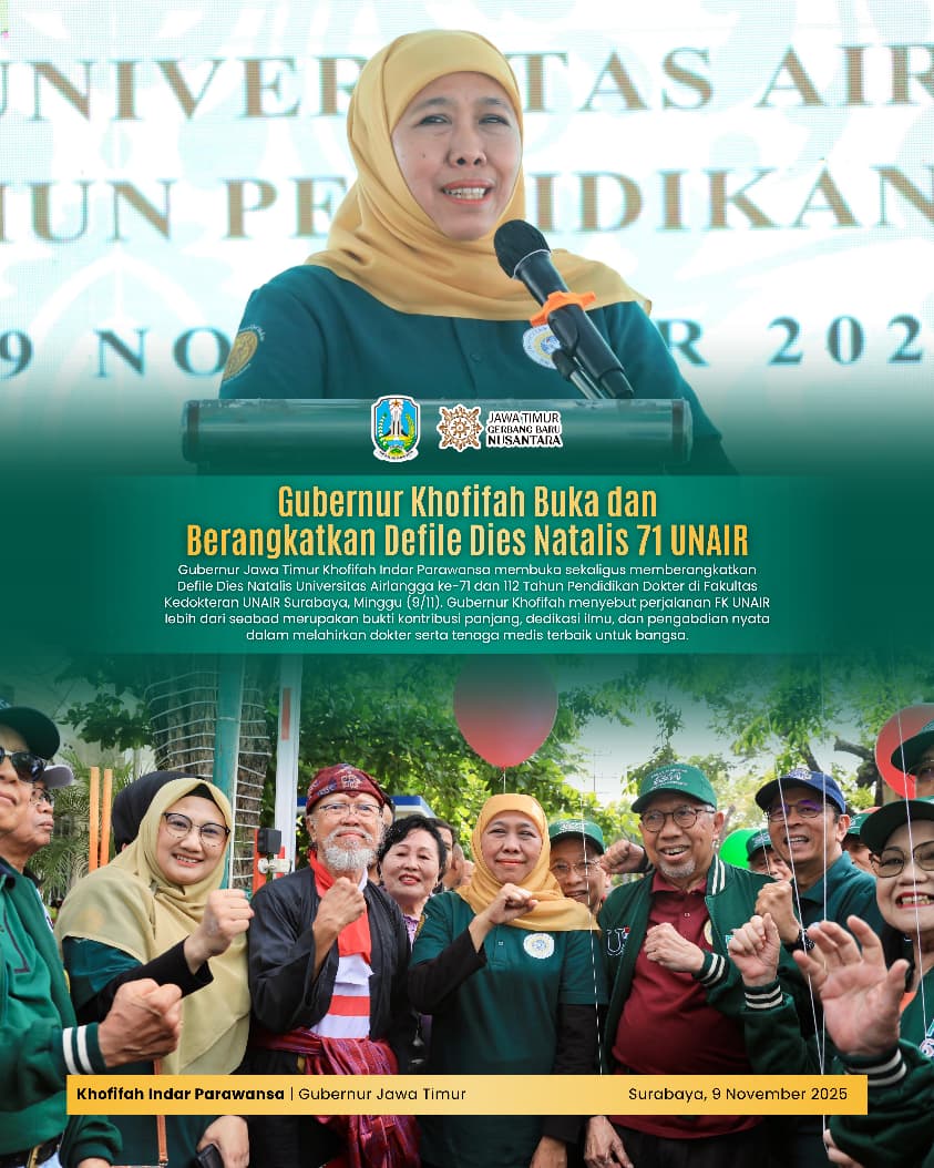 Dalam sambutannya, Gubernur Khofifah menyampaikan bahwa defile ini bukan sekadar ajang seremonial, melainkan perayaan atas perjalanan panjang, dedikasi, dan kontribusi nyata FK UNAIR selama lebih dari satu abad dalam membangun dunia medis Indonesia.