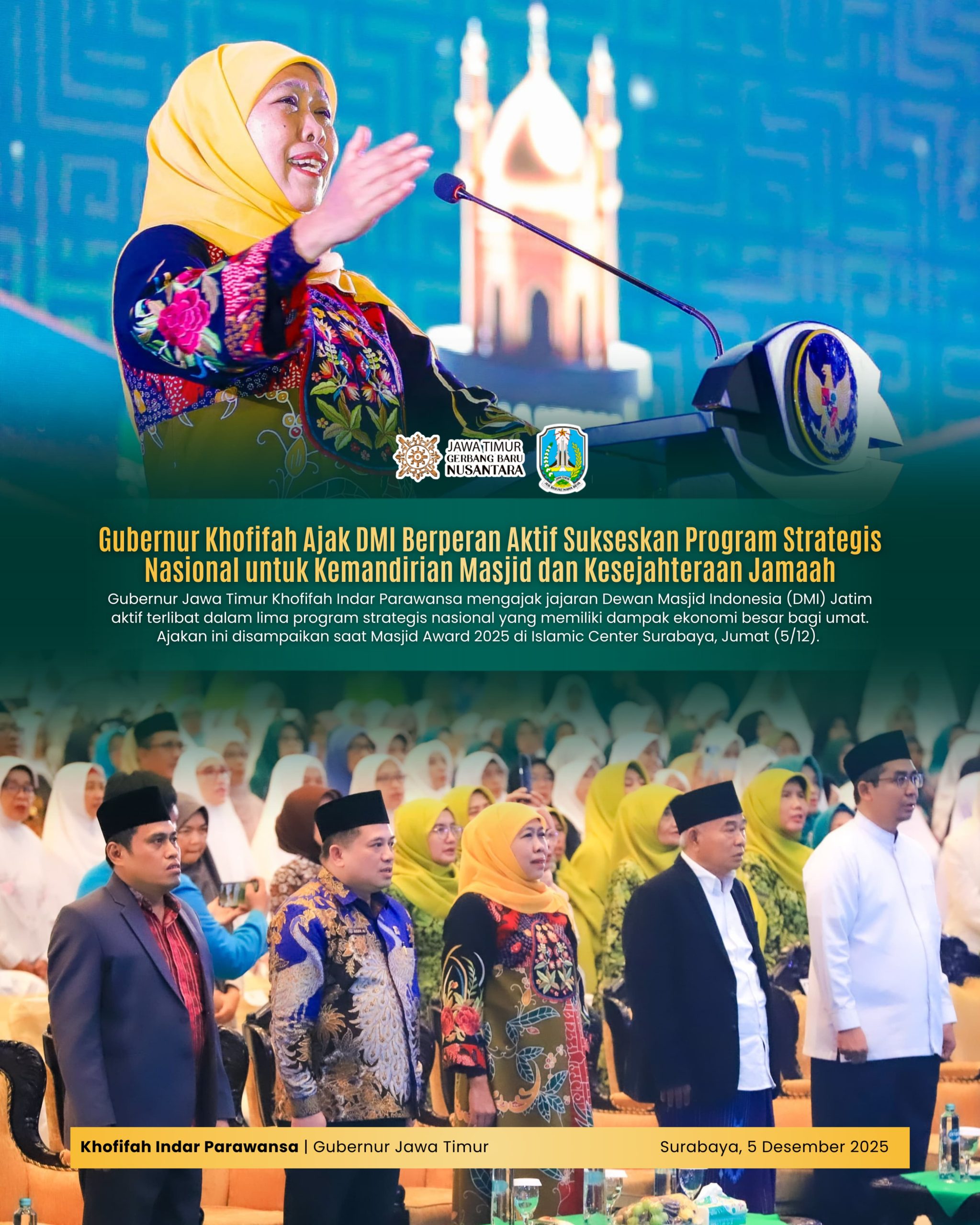 SURABAYA, 7 DESEMBER 2025 – Gubernur Jawa Timur Khofifah Indar Parawansa mengajak Pengurus Wilayah Dewan Masjid Indonesia (DMI) Provinsi Jatim untuk proaktif membaca peluang dan terlibat langsung dalam berbagai program strategis nasional yang tengah dijalankan pemerintah pusat. Ajakan tersebut disampaikan dalam acara Masjid Award 2025 di Islamic Center Surabaya, Jumat (5/12).