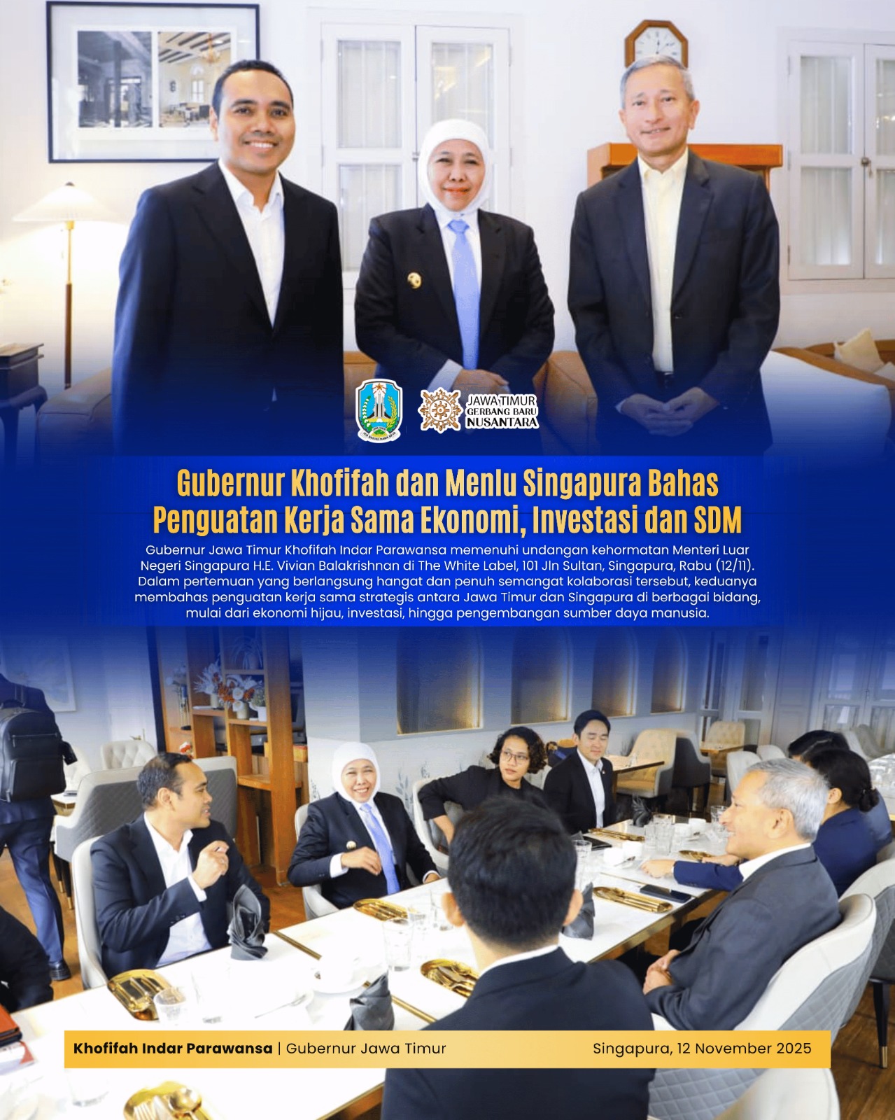 "Merupakan suatu kehormatan besar dapat berada di Singapura, dan saya sangat menghargai kesempatan untuk berbagi pandangan dengan Menteri Vivian Balakrishnan," kata Gubernur Khofifah.