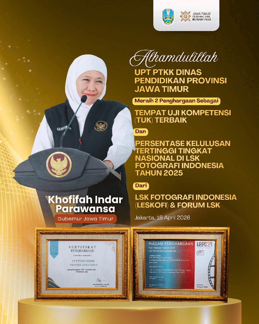 SURABAYA, 20  APRIL 2026 – Gubernur Jawa Timur Khofifah Indar Parawansa menegaskan komitmennya dalam penguatan sumber daya manusia (SDM) vokasi melalui capaian membanggakan Unit Pelaksana Teknis Pengembangan Teknis dan Keterampilan Kejuruan (UPT PTKK) Dinas Pendidikan Provinsi Jawa Timur.