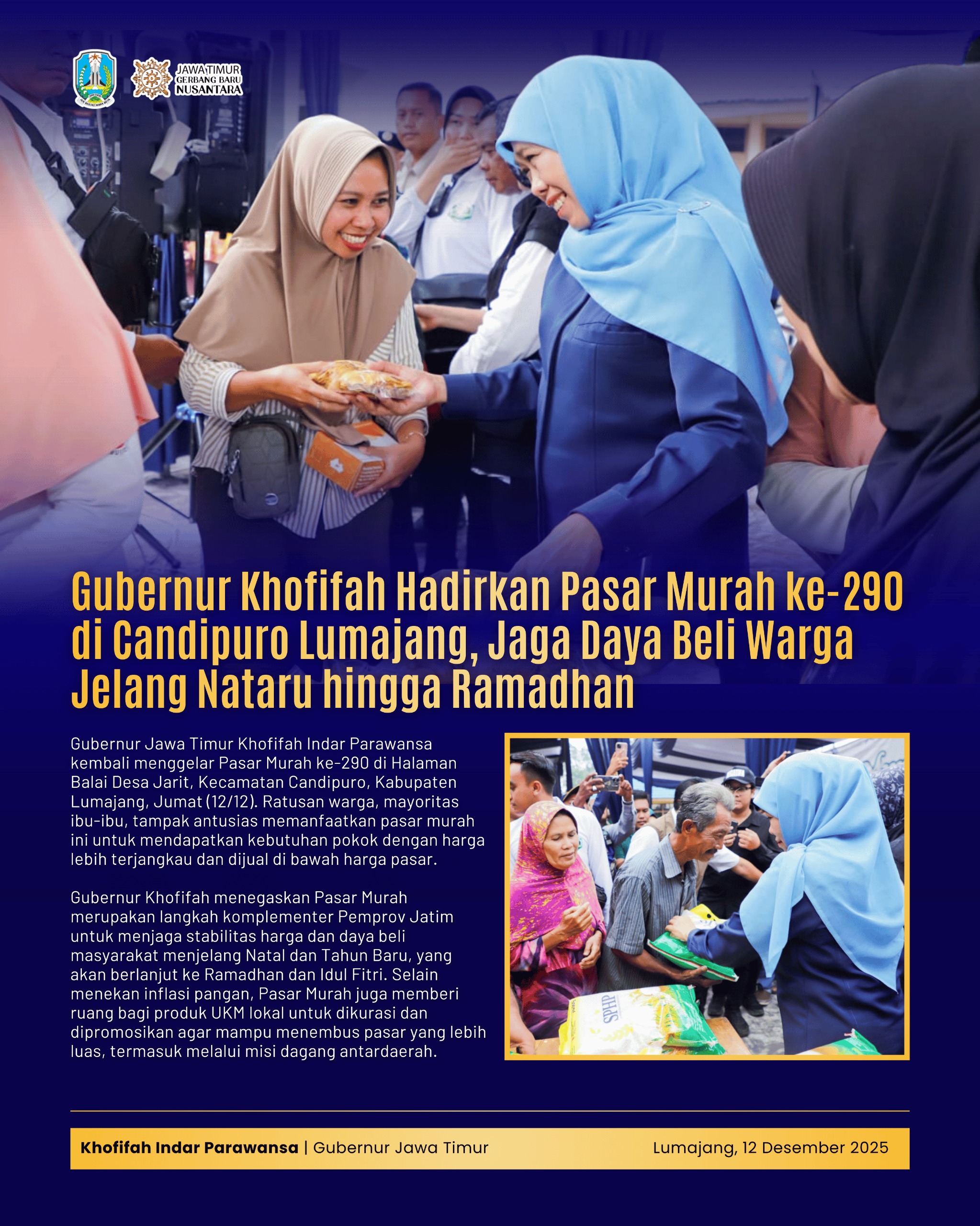 LUMAJANG, 13 DESEMBER 2025 – Gubernur Jawa Timur Khofifah Indar Parawansa kembali menggelar Pasar Murah bagi masyarakat. Kali ini, Pasar Murah ke-290 digelar di Halaman Balai Desa Jarit, Kecamatan Candipuro, Kabupaten Lumajang pada Jumat (12/12).