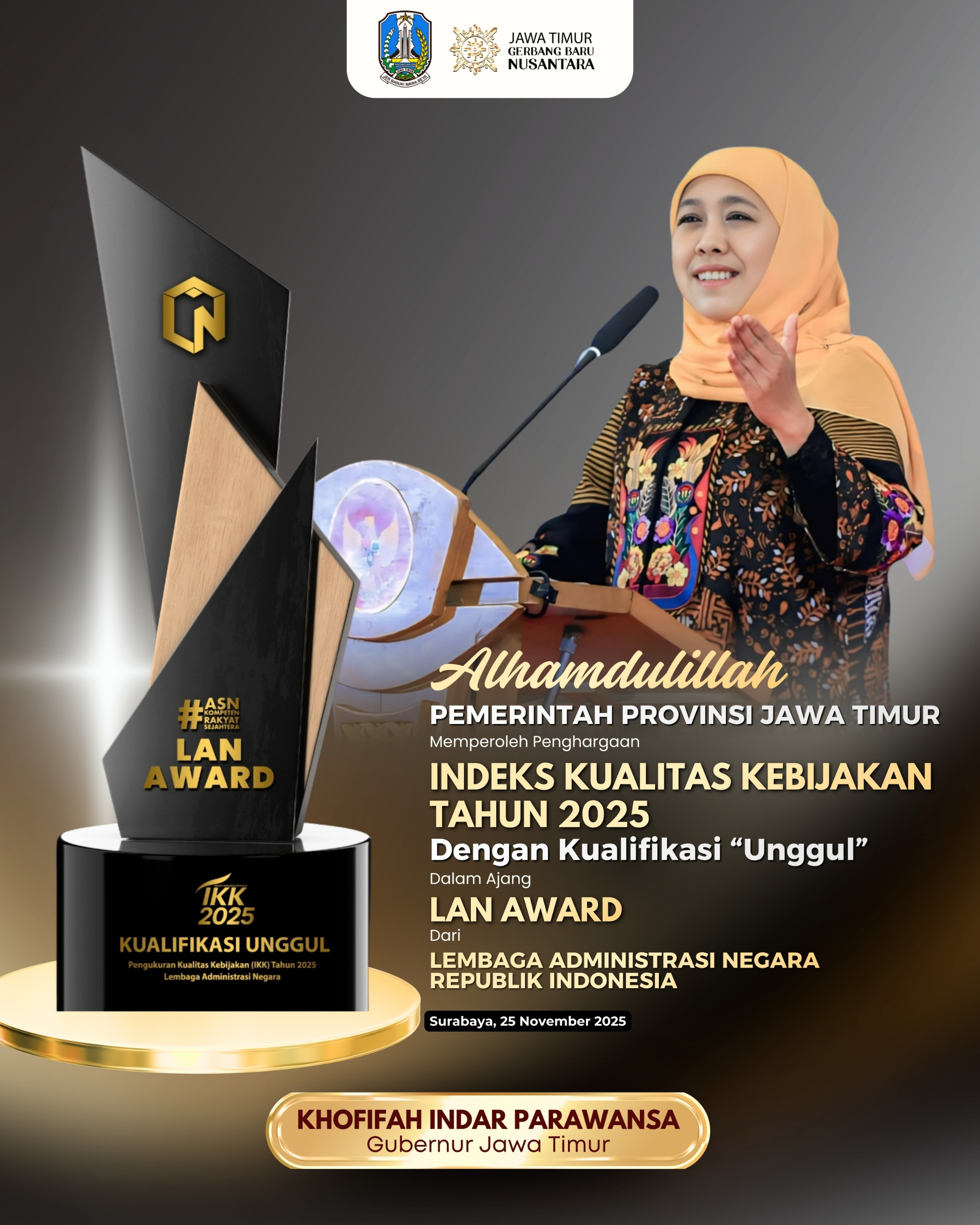 Pemerintah Provinsi Jawa Timur meraih penghargaan Indeks Kualitas Kebijakan (IKK) Award Tahun 2025 untuk kategori provinsi berkualifikasi unggul dari Lembaga Administrasi Negara Republik Indonesia (LAN RI).