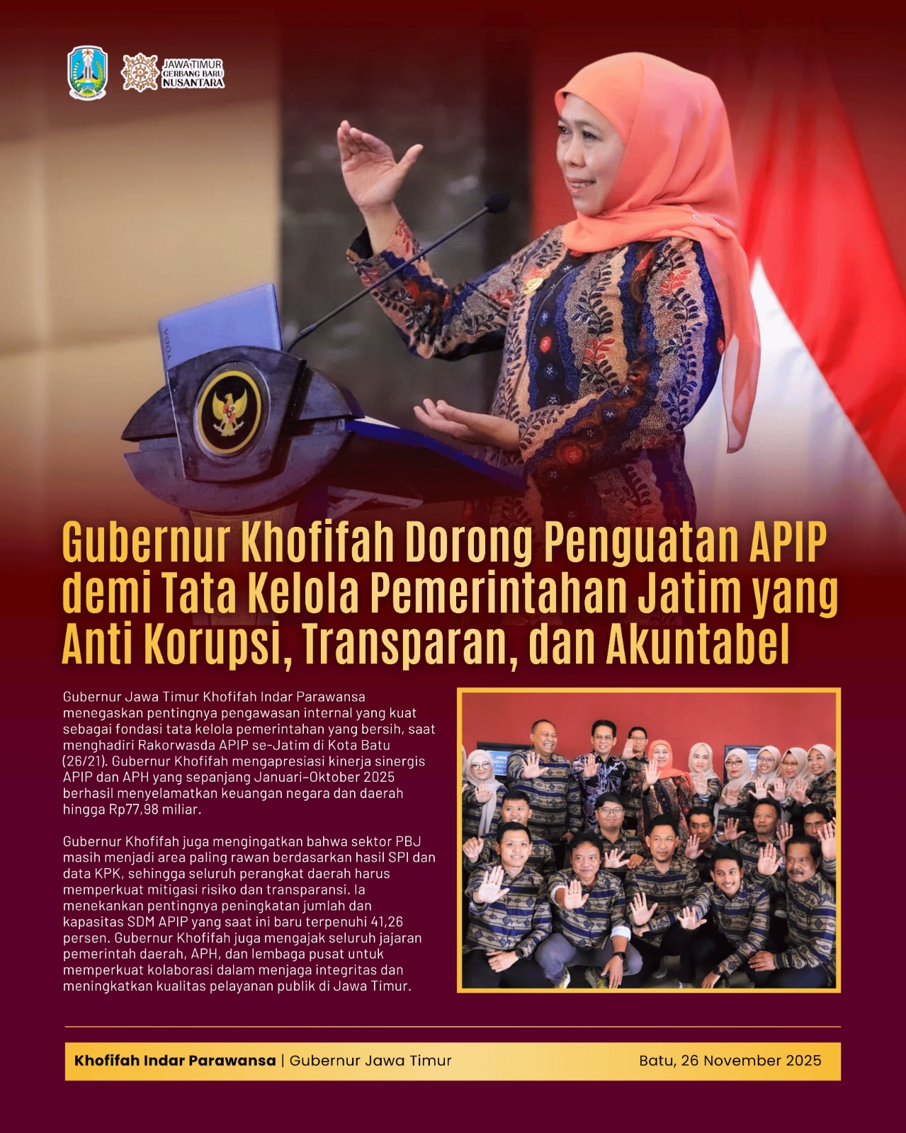 "Pengawasan yang kuat adalah kunci. Mari kita dorong pembangunan yang bersih, transparan dan akuntabel sebagai daya dorong utama mewujudkan Jawa Timur Gerbang Nusantara baru," pungkasnya.