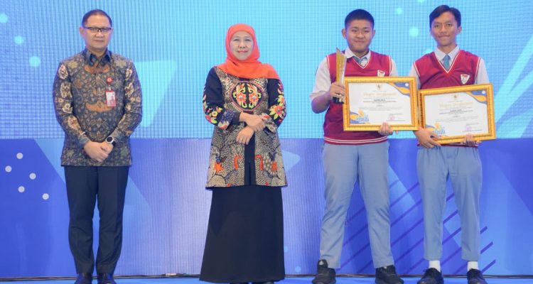 Gubernur Jawa Timur Khofifah Indar Parawansa memberikan apresiasi dan penghargaan kepada guru dan murid berprestasi dalam ajang Festival Teknologi Inf